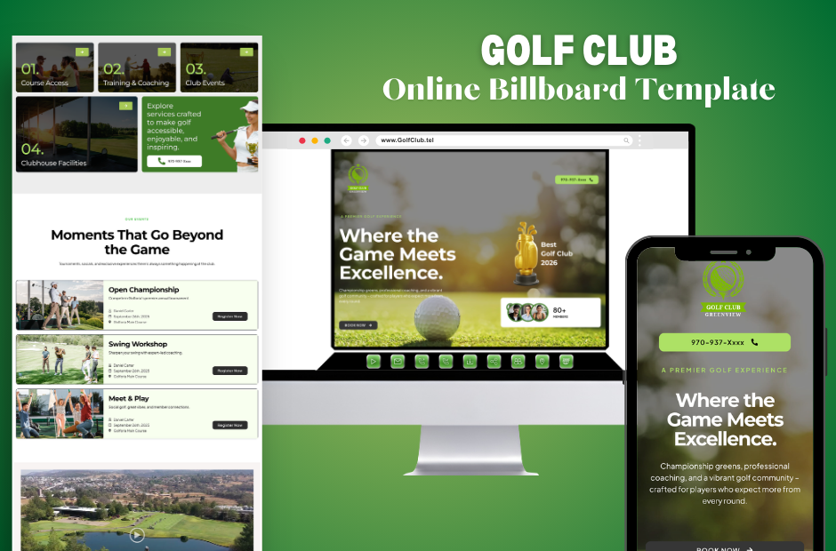 Showcase your golf club’s prestige, courses, and membership experience with a sophisticated, mobile-responsive Online Billboard. Attract serious golfers, highlight your facilities and events, and grow your member community with a professional single-page design built to impress from the very first visit.