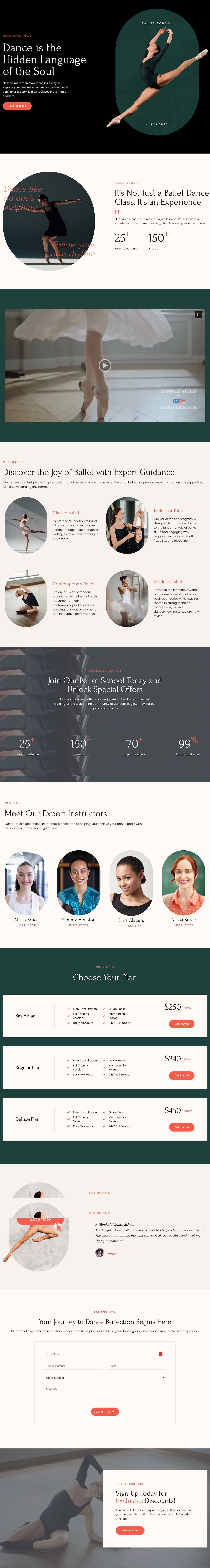 • Trust-Building Instructor Display — Strategic sections featuring your qualified teachers, years of experience, award achievements, and student success stories that differentiate established ballet schools from recreational dance programs