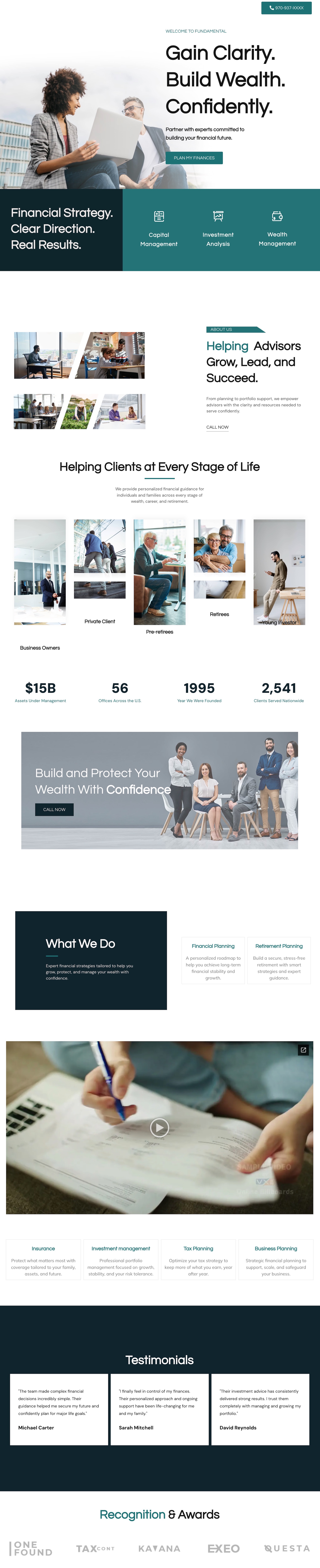 • Social Proof with Testimonials and Awards — The template features a testimonials carousel alongside a recognition and awards section with partner brand logos. These trust signals carry significant weight in the financial sector, where new clients rely heavily on peer validation and industry credibility before committing to a firm.