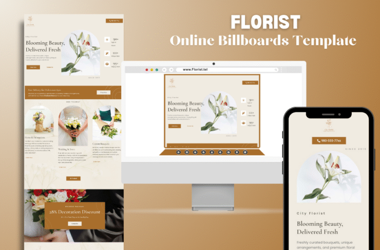 Elegant florist template featuring artistic arrangement portfolios, wedding packages, and custom bouquet services. Mobile-responsive design with memorable .TEL domain builds trust and positions florists as premium artisan specialists for life’s special moments.