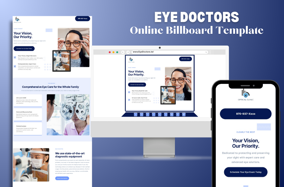 Professional eye doctor template featuring comprehensive service showcases, advanced technology displays, and qualified doctor profiles. Highlight LASIK procedures, glaucoma care, pediatric exams, and contact lens fittings with responsive layout and memorable .TEL domain. Positions your practice as a trusted vision specialist patients choose for lifelong eye health.